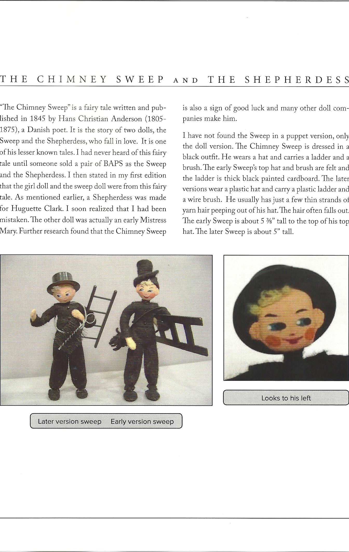 We know that BAPS made a Shepherdess for Mrs. Clark. Maybe one was never publically made to go with the Chimney Sweep. I have seen the Chimney Sweep made in other forms and by other doll companies. I was assuming that the Sweep was from THE SHEPHERDESS AND THE SWEEP tale by Hans Christian Anderson. Google research on Chimney Sweeps also indicates that the Sweep is considered good luck; so, maybe he was made as a good luck figure and not as the character in the fairy tale.